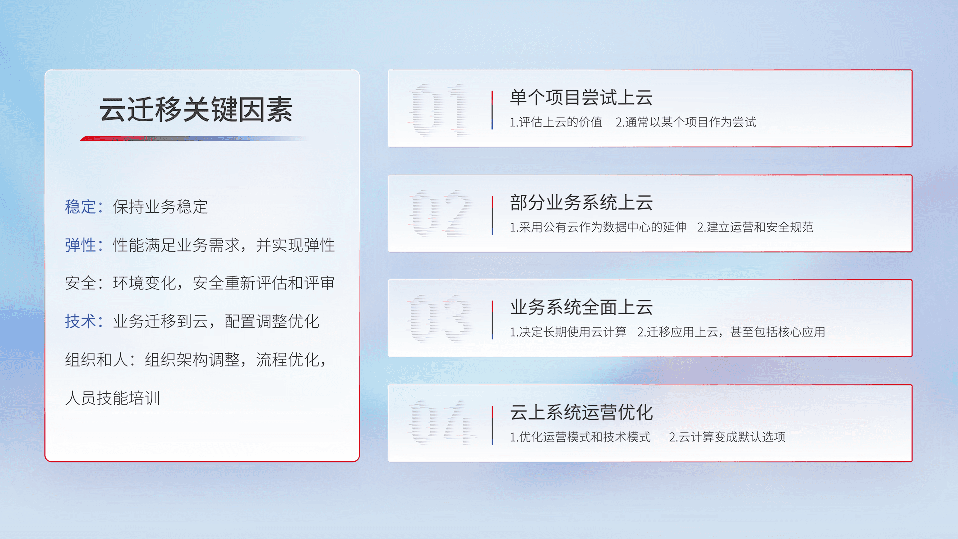 结合实际业务,,,从规划设计、、、云平台选型、、、云原生改造、、数据迁移、、集成交付,,,,迁移全过程为客户识别最佳上云路径,,,,做好风险识别管理,,设计网络架构、、身份权限、、、、安全审计合规、、、、操作审计、、、、日志审计、、监控告警策略、、多站点容灾设计等,,对云上基础设施进行整体规划,,,提升IT治理水平,,,以满足弹性、、高可用、、高性能的需求。。。。